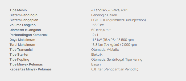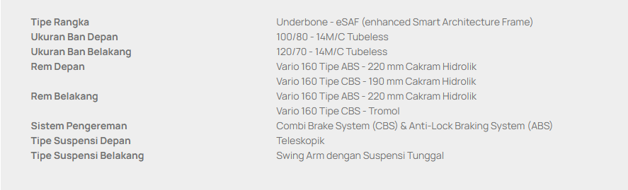 | VARIO 160 CBS | 28,500,000 | 2900 | 2000 | 2136 | 1400 | 1711 | 1100 | 1462 | 1100 | 1310 |